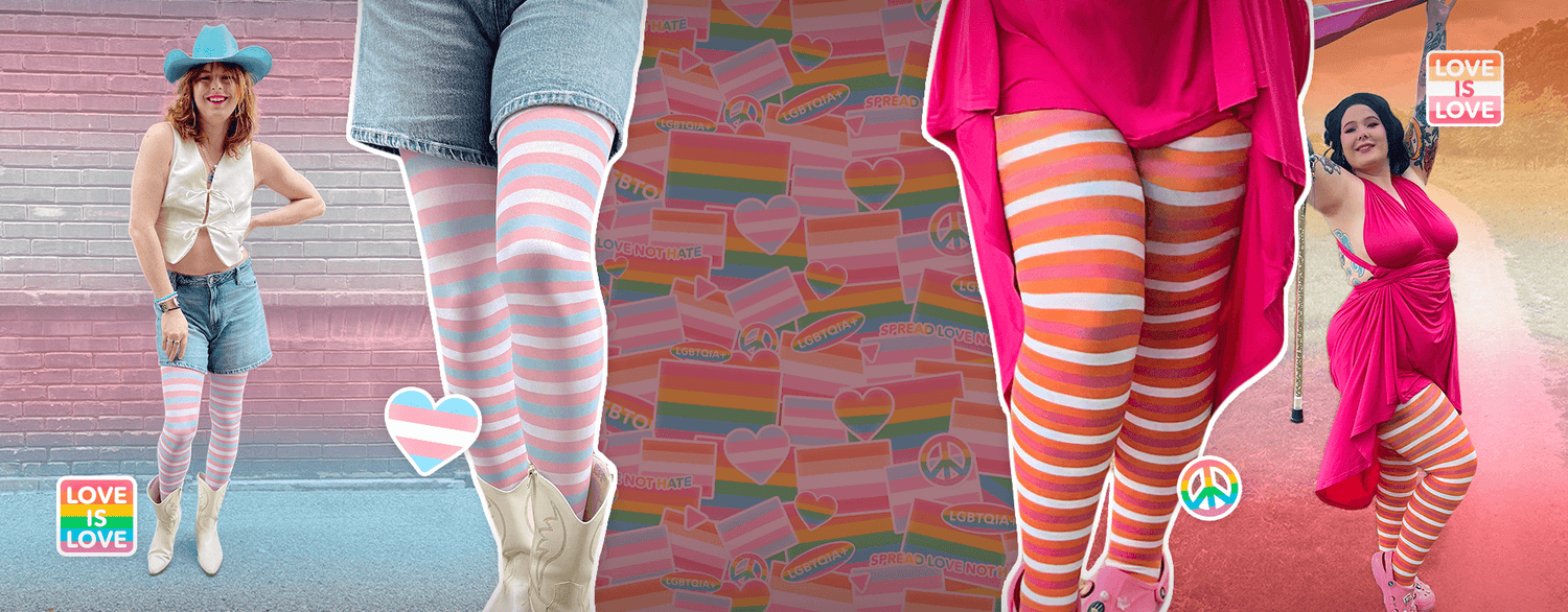 Show up, show OUT, show every amazing colour of you. Loving loud and celebrating every identity isn't just for Pride month, it's the Snag way, every single day. We build inclusivity into everything – from our team to the comfy, awesome clothes we design for every body. And this spirit bursts into full colour with our pride-flag inspired Love is Love collection of tights!