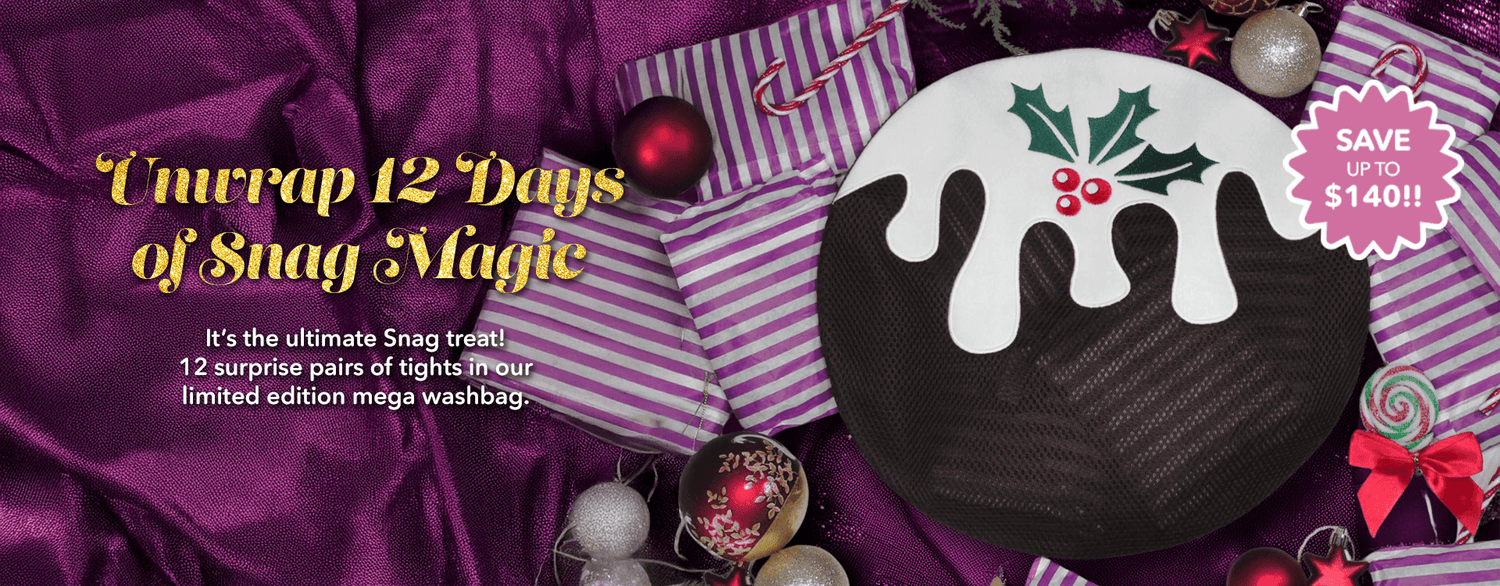 We’ve packed 12 individually wrapped mystery pairs of our super-comfy tights into a brand-new, mega-sized Christmas pudding washbag. The Snag Elves have hand-picked every pair from our previous collections, so what you get is a total surprise. Think fan-favourites, hidden gems, and must-have classics.