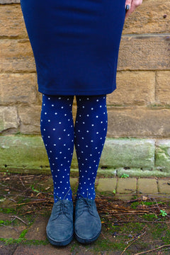 The rich navy base gives smooth, warm coverage, while the repeating white dots bring a touch of fun that pairs effortlessly with dresses, skirts, or chunky knits. Versatile, comfortable, and effortlessly stylish. Made with our signature super-stretchy, stay-put fit, these tights mould to your body without feeling tight or restrictive. The high waistband sits comfortably without rolling or digging in, and the soft, durable fabric is designed to keep up with everything from office days to late-night adventures. A breathable cotton gusset keeps you feeling fresh, making Sweet Spot your go-to tights all winter long.