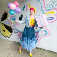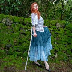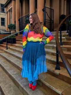 Three ocean-kissed shades of blue, one seriously beautiful skirt. The Ombre Mesh Maxi Skirt in Blue flows from Ice Blast, a frosty baby blue at the hem, drifting into Denim, a soft faded blue inspired by your favourite worn-in jeans, and finishing with Bone China, a deep blue with a hint of teal that echoes the watery depths of Delftware.