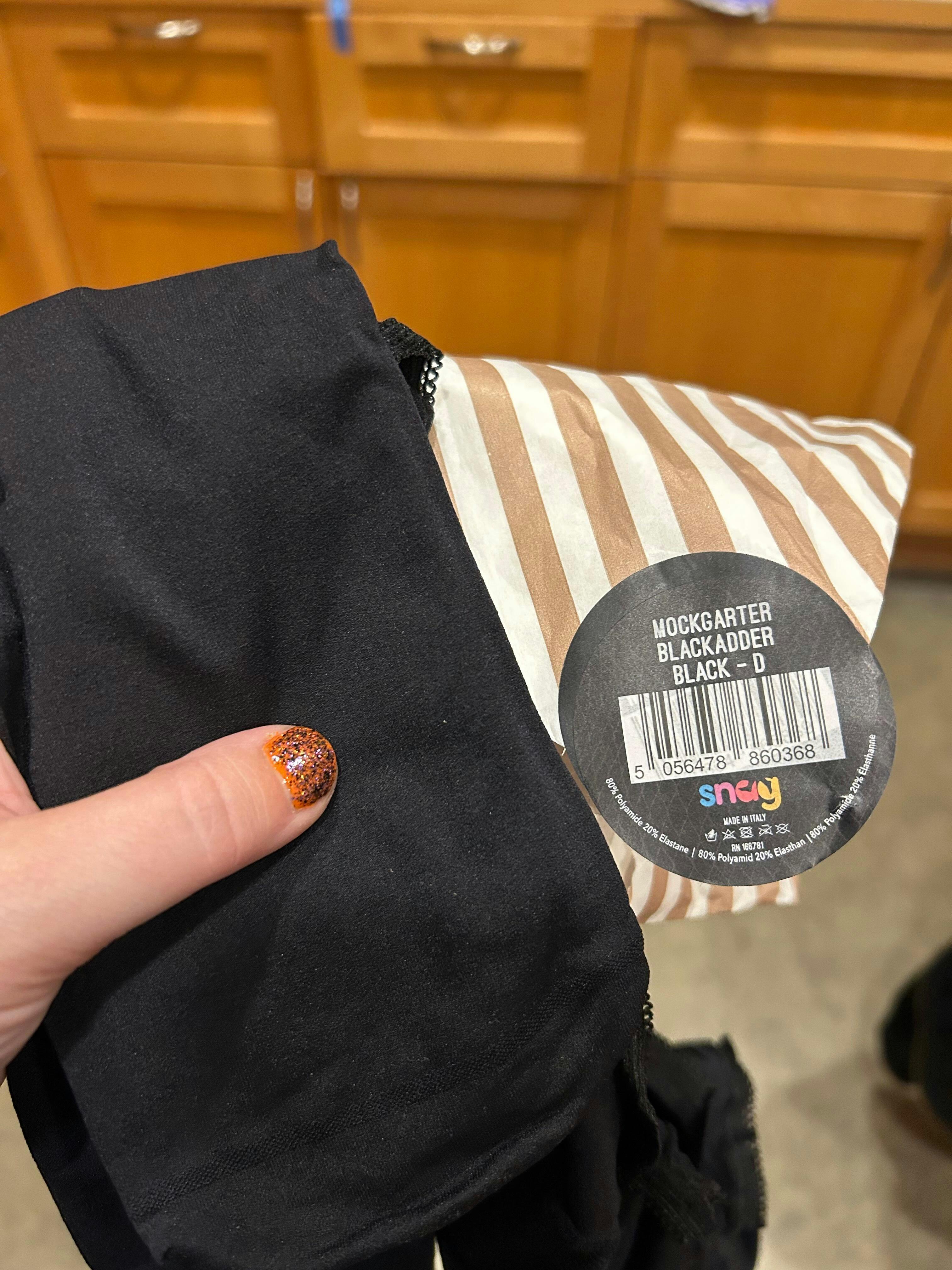 Snaggler favourite Blackadder is now in mock garters. These are a super soft, really stretchy and a faux fishnet, so they look like fishnets, but are really robust and durable. They give the same look as stockings and suspenders with the accessibility of tights. Easy to put on with a high rise waist band so there is no rolling down.