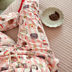 Our Sweet Treat PJ Bottoms make bedtime feel like the best tea party ever. A proper celebration of Britain’s finest cakes and puddings (think Battenberg, Bakewell tart, Victoria sponge, chocolate Swiss roll, trifle, French fancies and a scattering of tiny hearts) all tumbling across soft pink and white candy stripes.