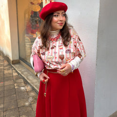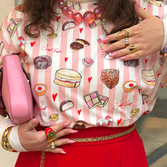Our Sweet Treat PJ Boxy Tee makes bedtime feel like the best tea party ever. A proper celebration of Britain’s finest cakes and puddings (think Battenberg, Bakewell tart, Victoria sponge, chocolate Swiss roll, trifle, French fancies and a scattering of tiny hearts) all tumbling across soft pink and white candy stripes.